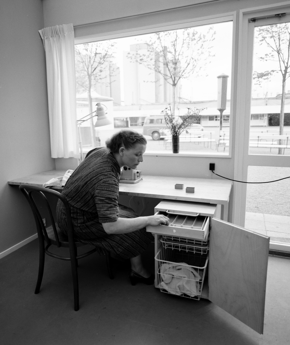 Interiör, kontorslokal med fönster och glasdörr vilka vetter ut mot gatan. Kvinna vid skrivbord mot fönstret.