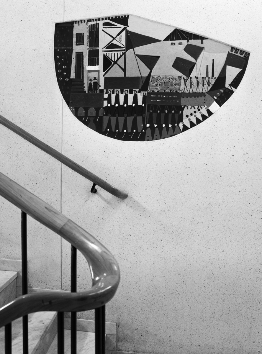 Detalj av trapphus med emaljmålning av Randi Fischer