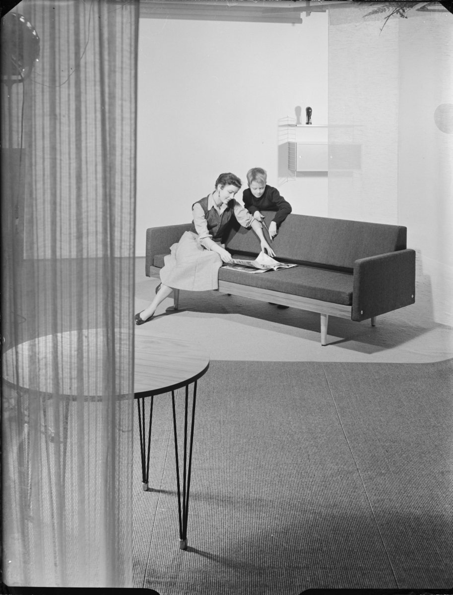 Titel: OMSLAG STRING I BILDEN, BÄDDSOFFA MED ARRANGEMANG I ATELJEN