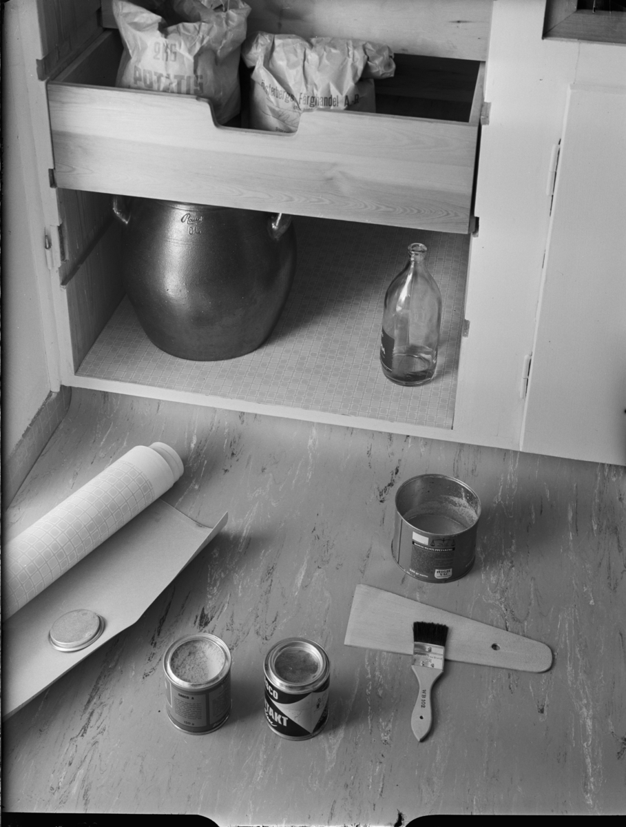 KÖKSSKÅP MED PLASTPAPPER PÅ HYLLORNA