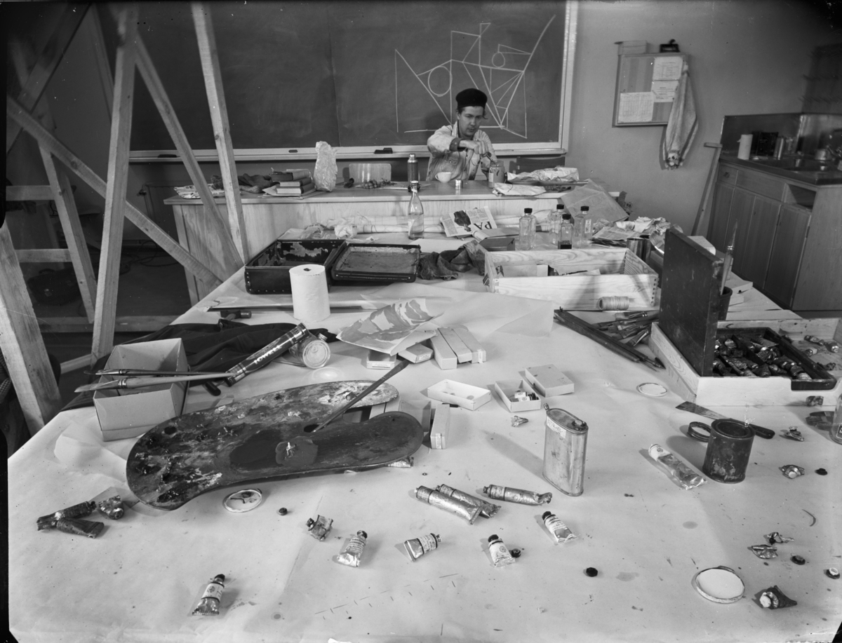 Konstnären Lennart Rodhe under arbete med väggmålning i Ängby läroverk