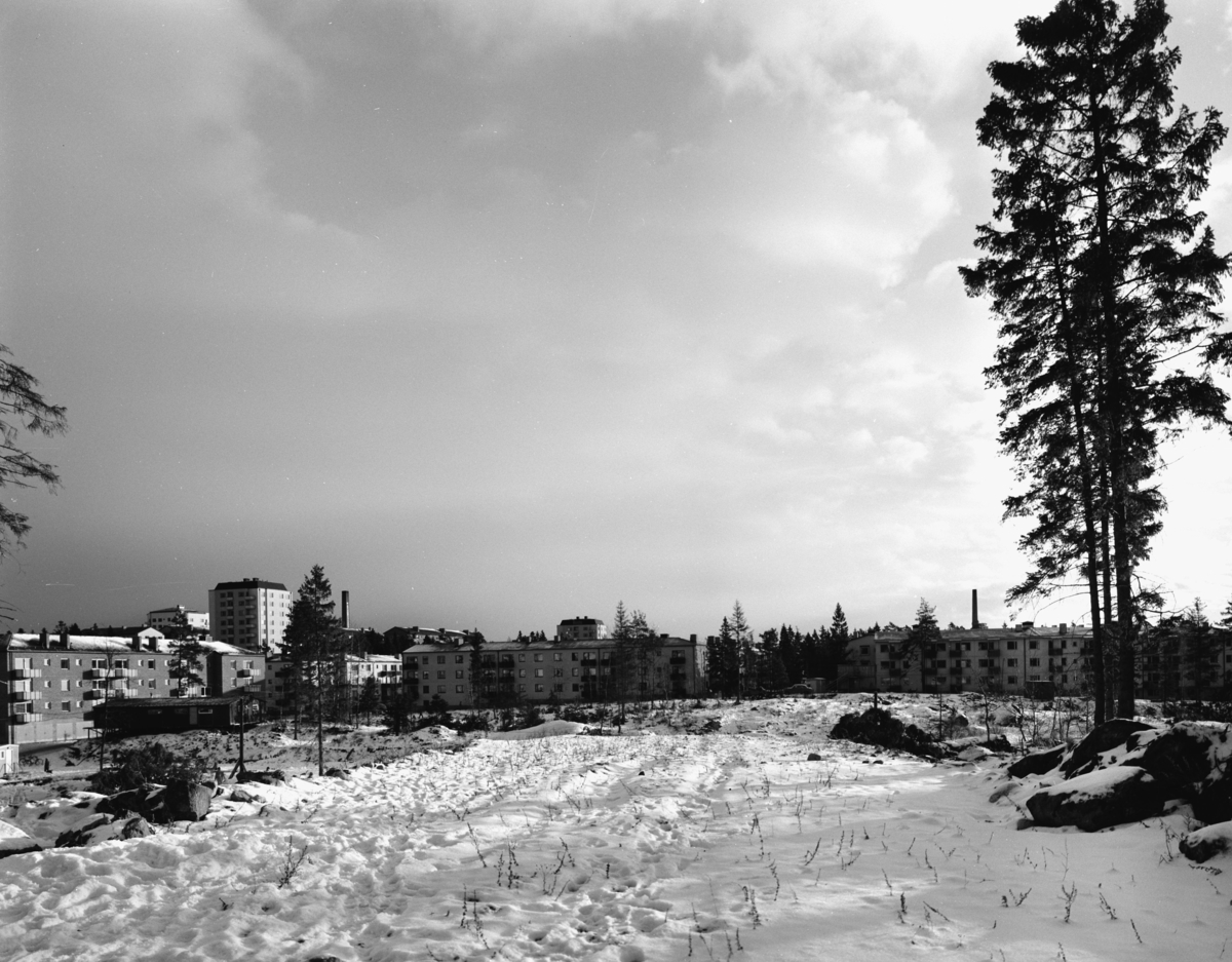 Exteriör, snötäckt fält. I fonden bostadsområde i blivande centrum