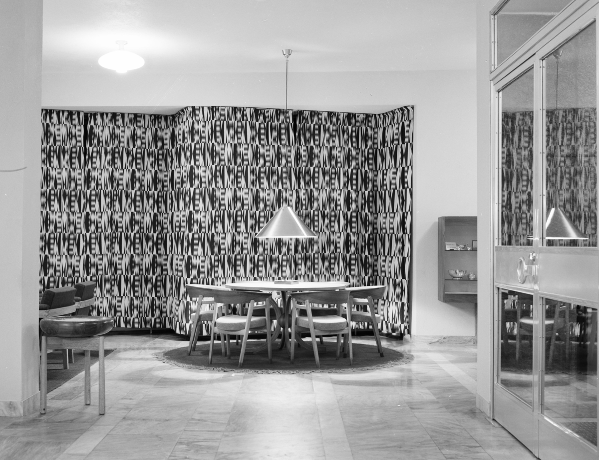 Interiör, sällskapsrum med mönstrat draperi mot fondvägg.