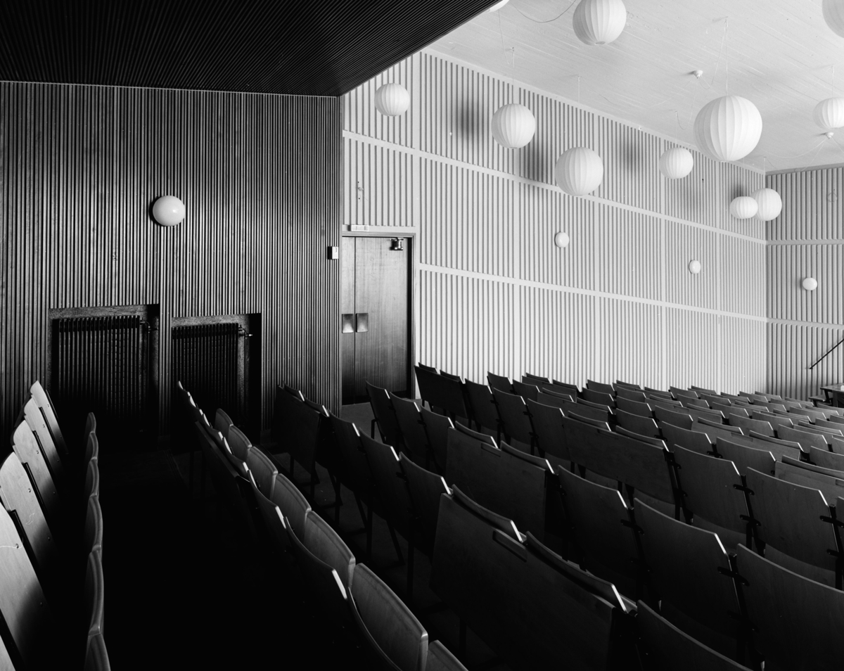 Interiör, aulan med väggar av räfflad platsgjuten betong och runda taklampor.