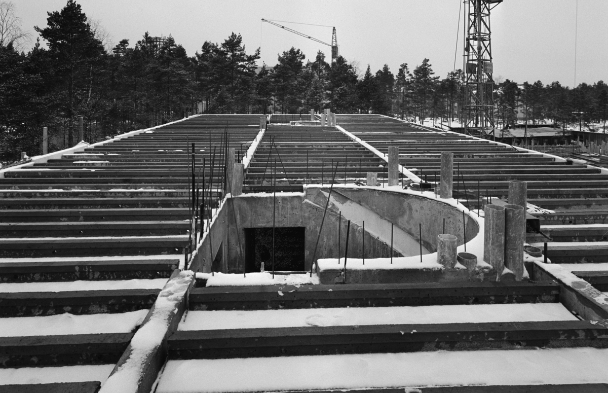 Titel: Bygge Exteriör av byggnad under uppförande med lyftkran i bakgrunden. Bilden ät tagen uppifrån.
