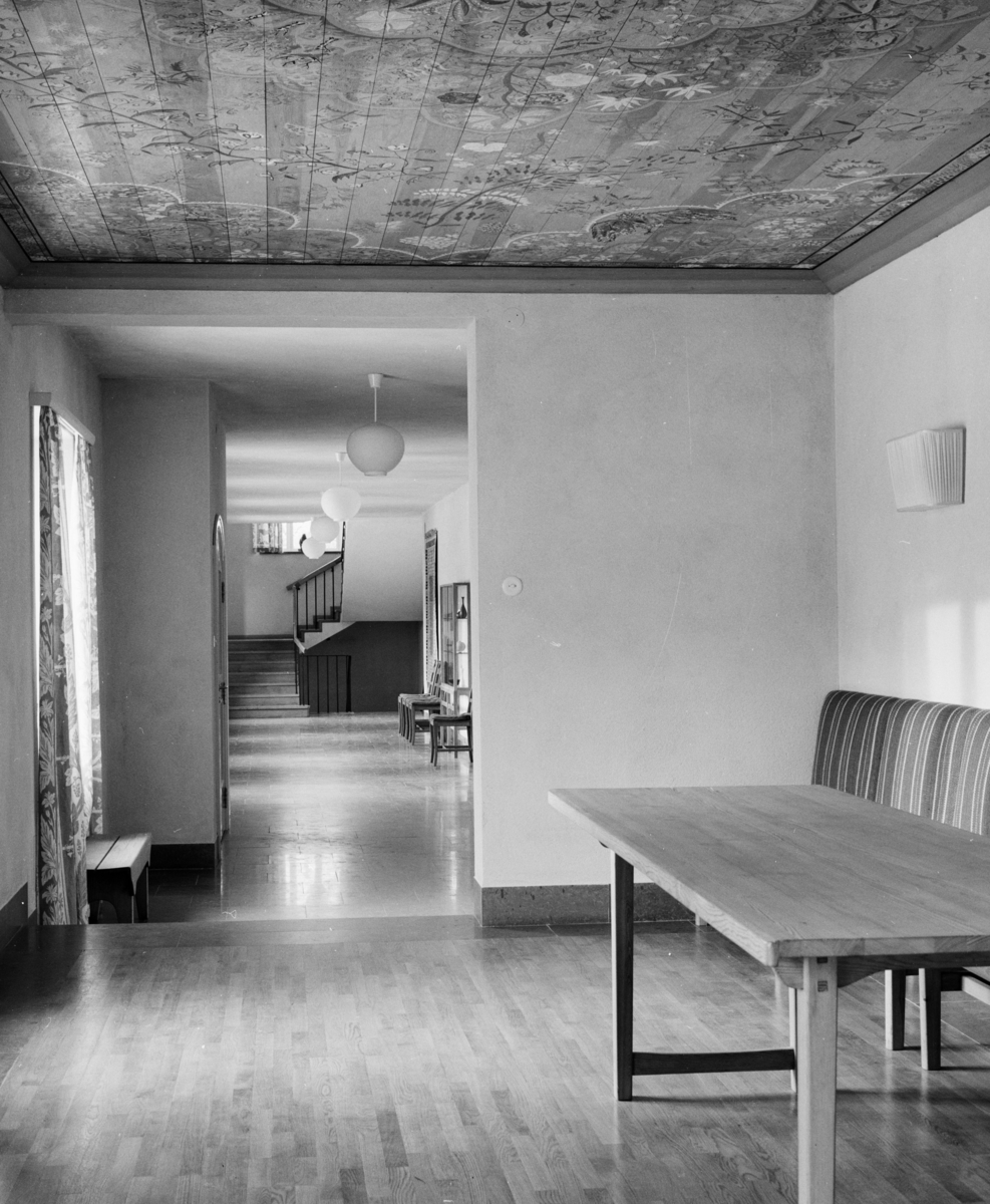 Interiör, rum i fil. I förgrunden bord och bänk.