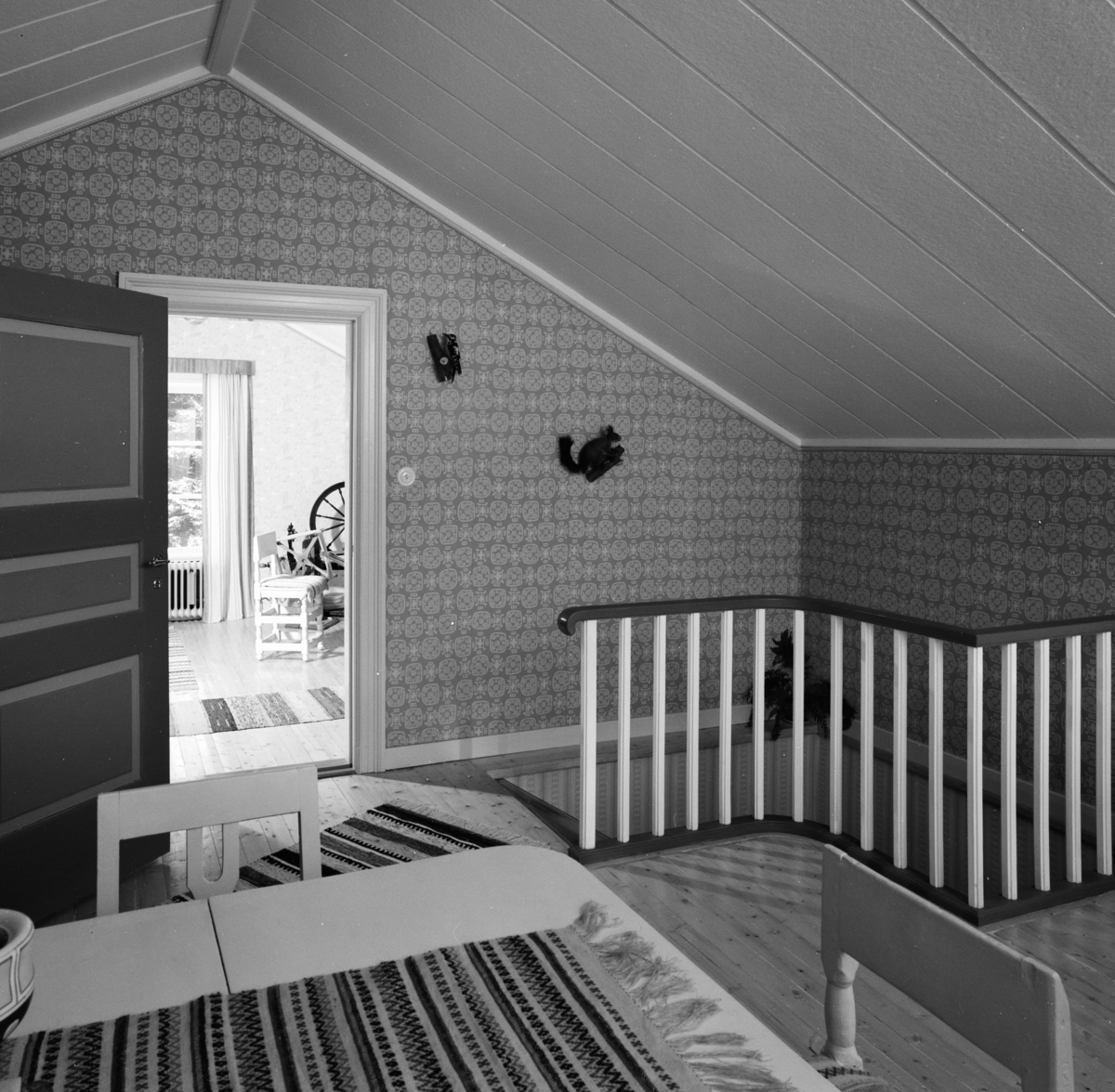 Interiör, övre planets trapphall, bord med vävd duk i förgrunden