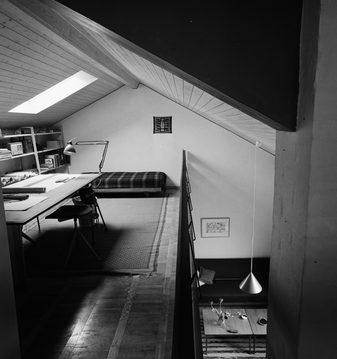 Interiör, entresolvåning under snedtak, med skrivbord och säng. Ljus från takfönster