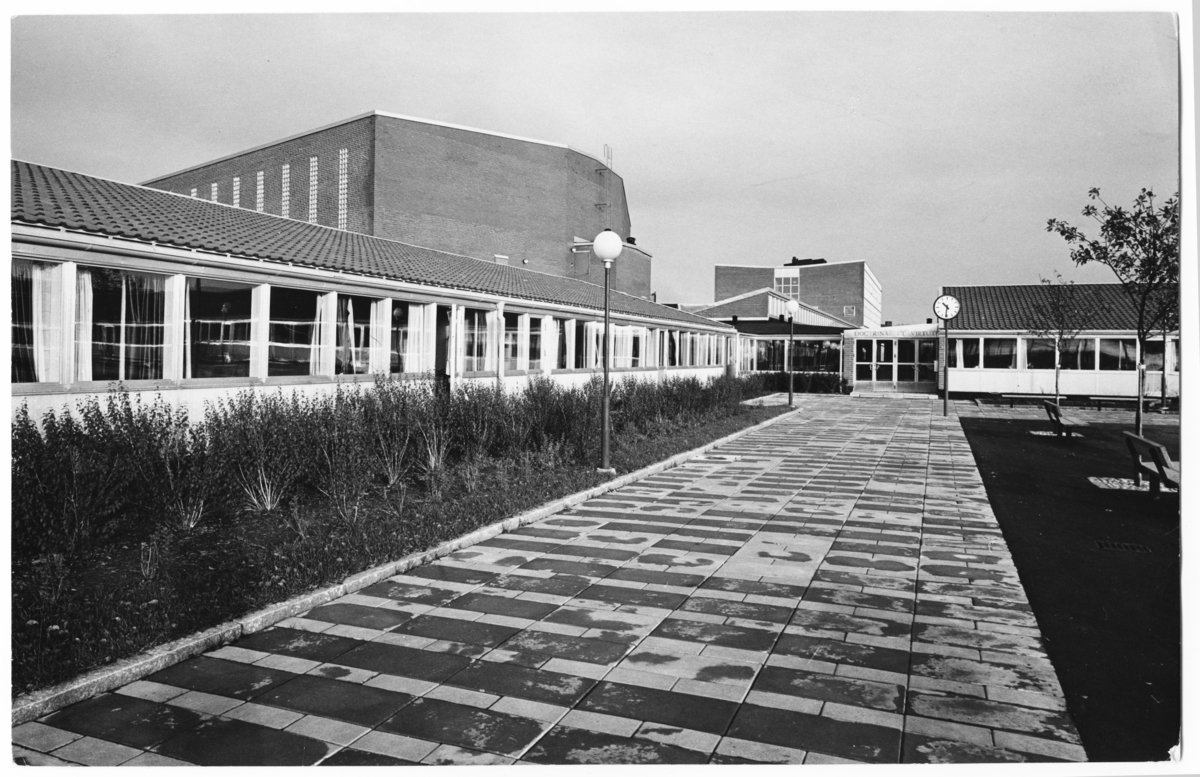 Exteriör, stensatt gång mot entrén till västra aulan. Klocka, lyktstolpar