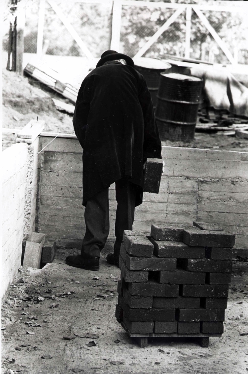 Sigurd Lewerentz vid byggarbetsplats, S:t Petri kyrka
