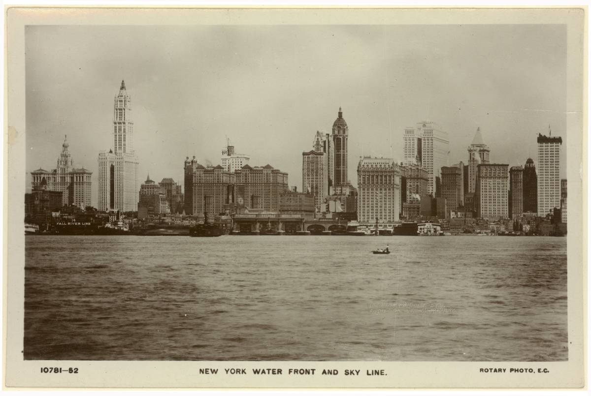 Titel: New York water front and sky line Exteriör. Vy. Vatten i förgrunden.