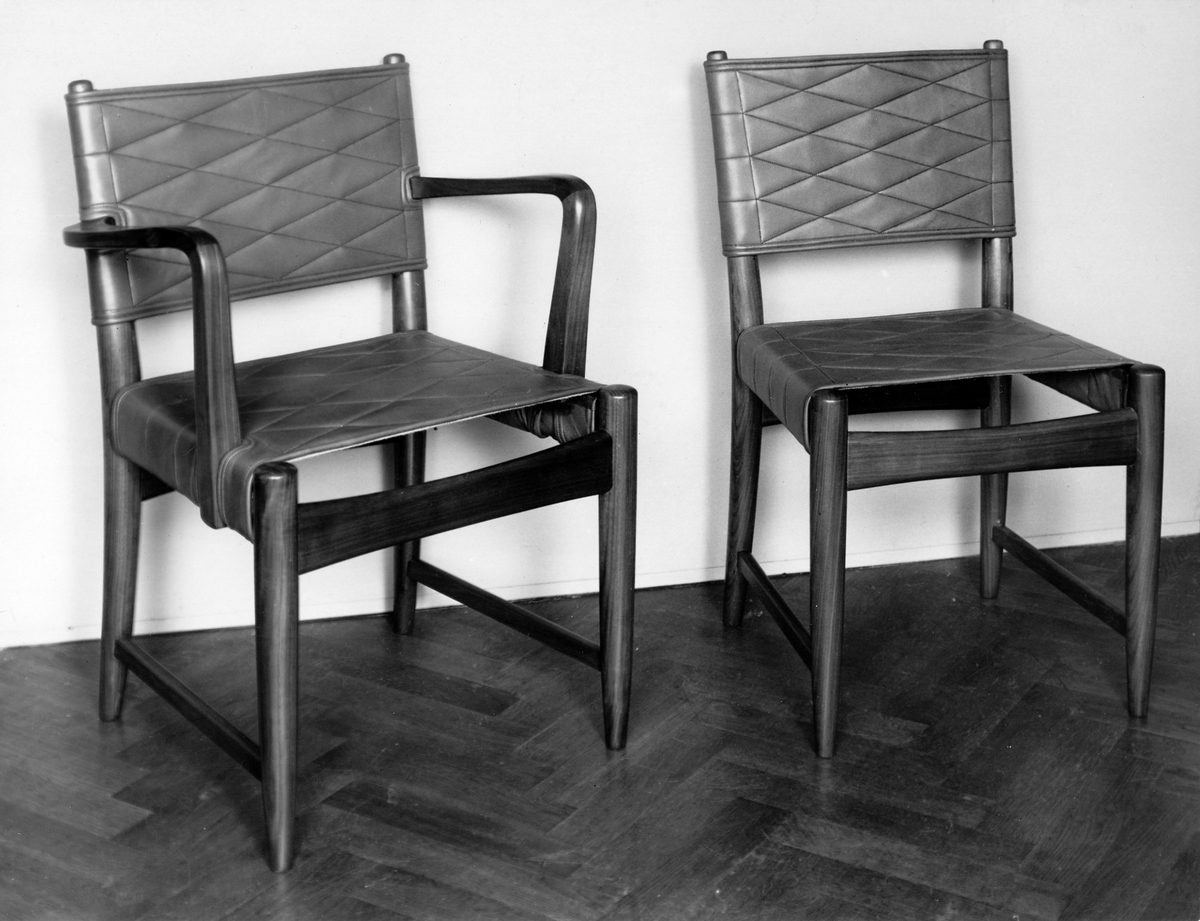 Interiör, inredning. Stol och karmstol. Hantverkslotteriets tävling. 1:a pris valnöt och dubbelt skinn med tunn stoppning.