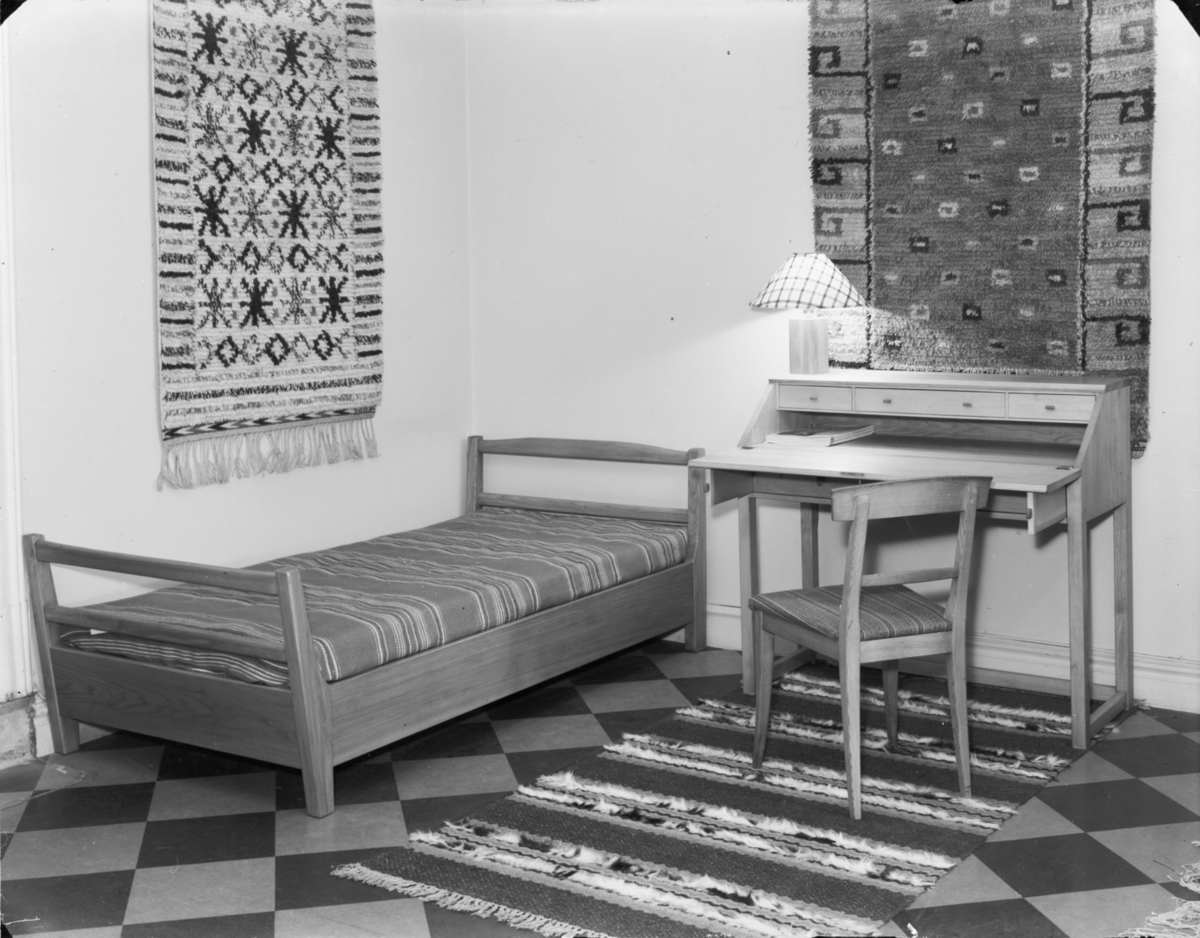 Säng, bonader, skrivbord och stol