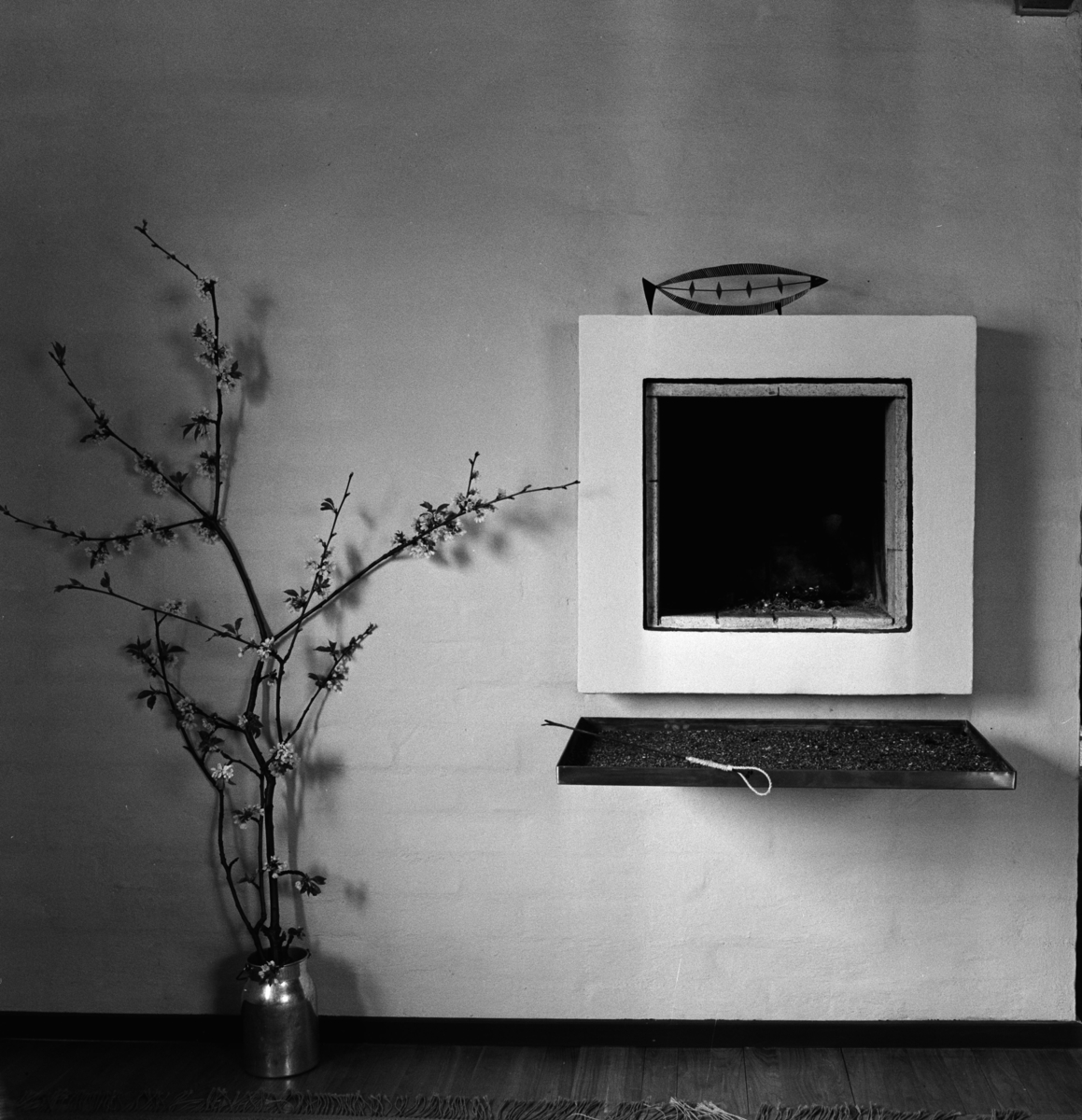 Interiör, Roy Viktorssons villa. Blommande gren i vas vid väggmonterad öppen spis