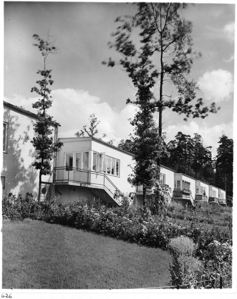 Titel: Radhus Exteriör. Balkonger med trappa till marken. Två träd och trädgårdar i förgrunden.