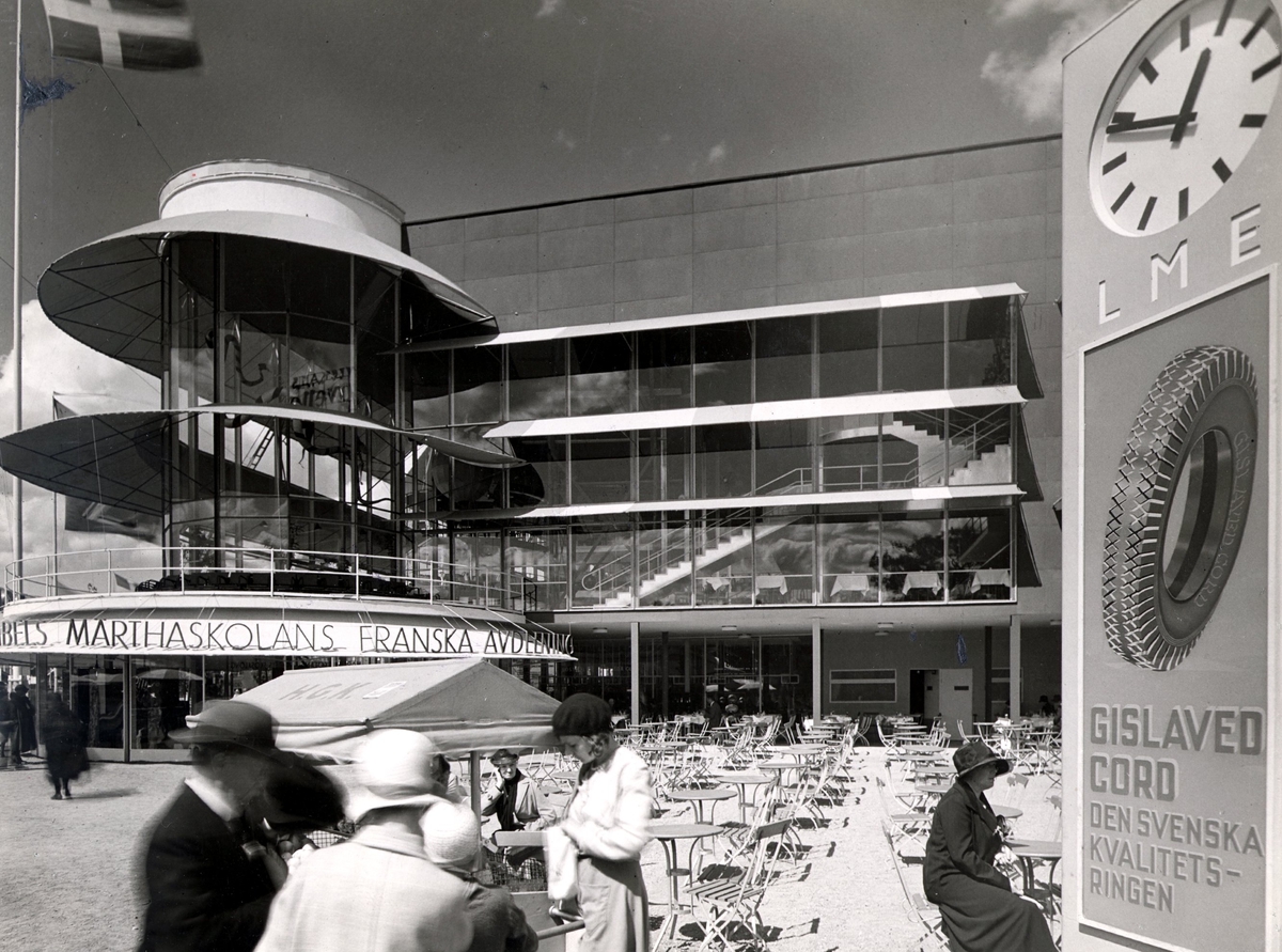 Huvudrestaurangens kortsida. Exteriör med servering och paviljong.
