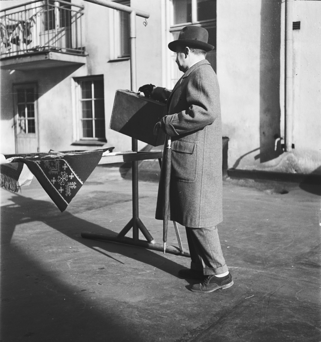 Man med hatt, rock och resväska vid en piskställning på en bakgård