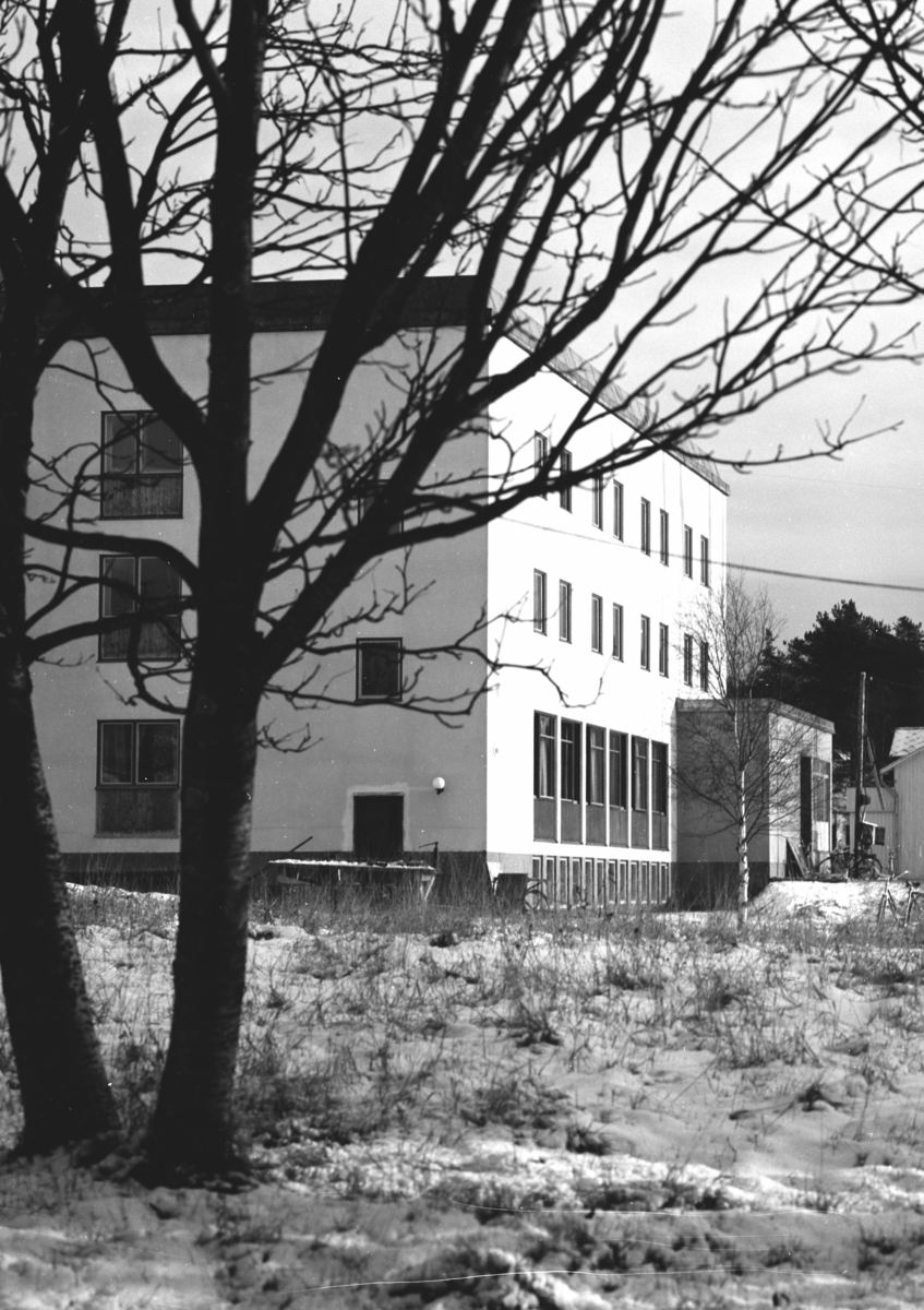 Exteriör, gavelfasad som vetter mot gräsplan med träd i förgrunden.