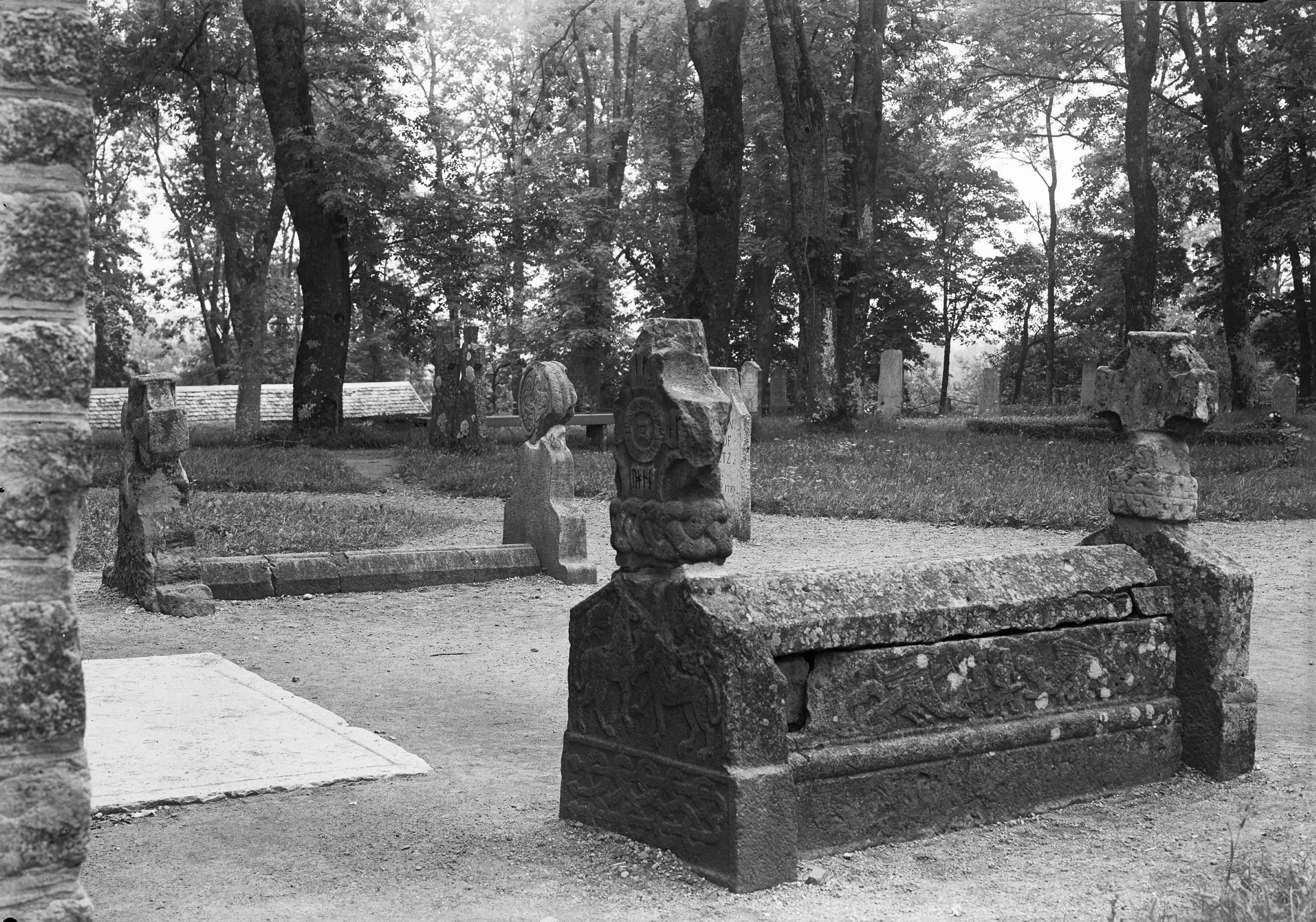 Gravmonument vid kyrkans västra sida.