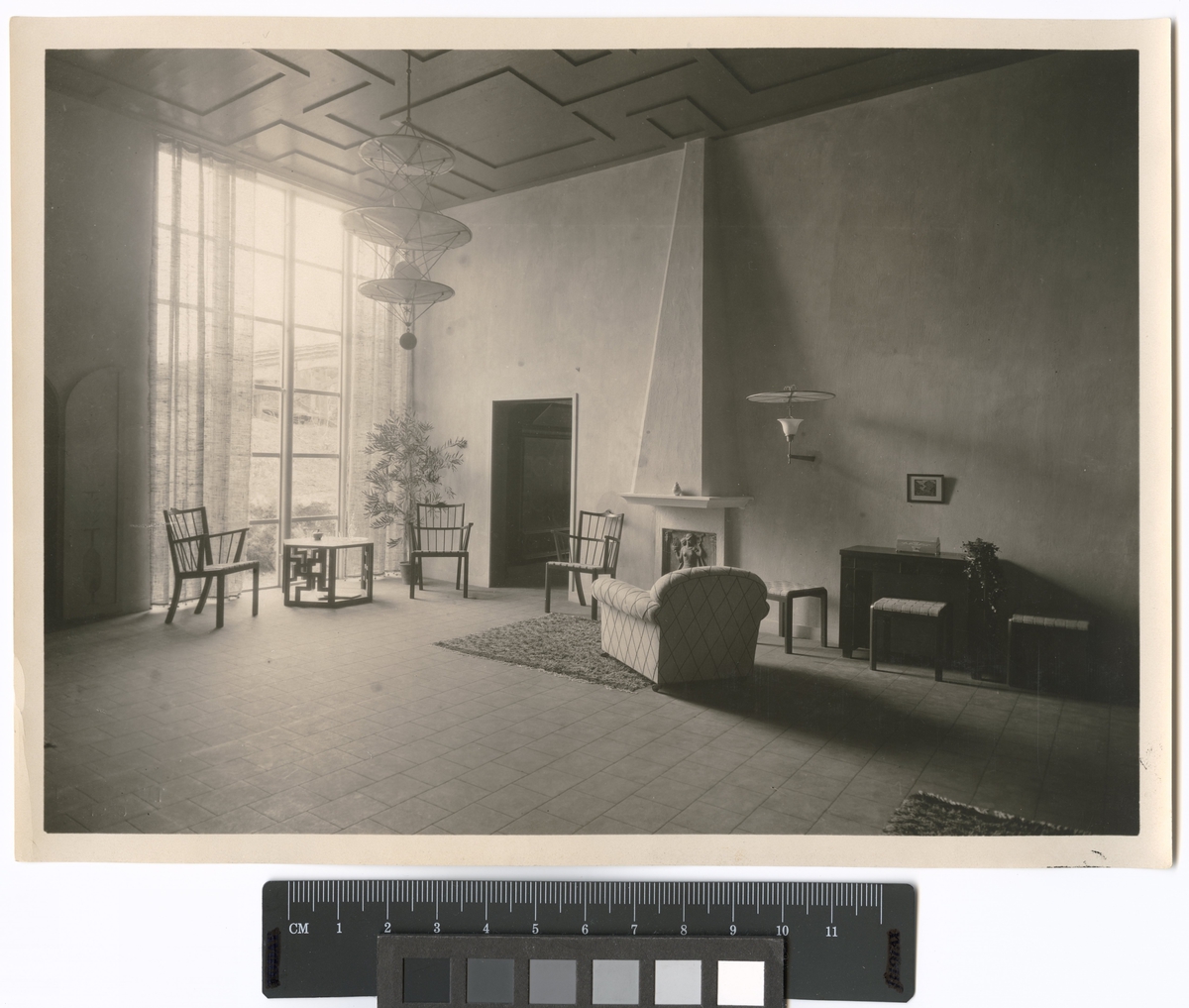 Konstindustrins byggnad. Möblerad hall med öppen spis för NK
