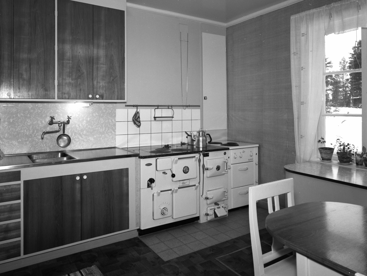 Interiör av kök, diskbänk och spis med del av matbord i förgrunden