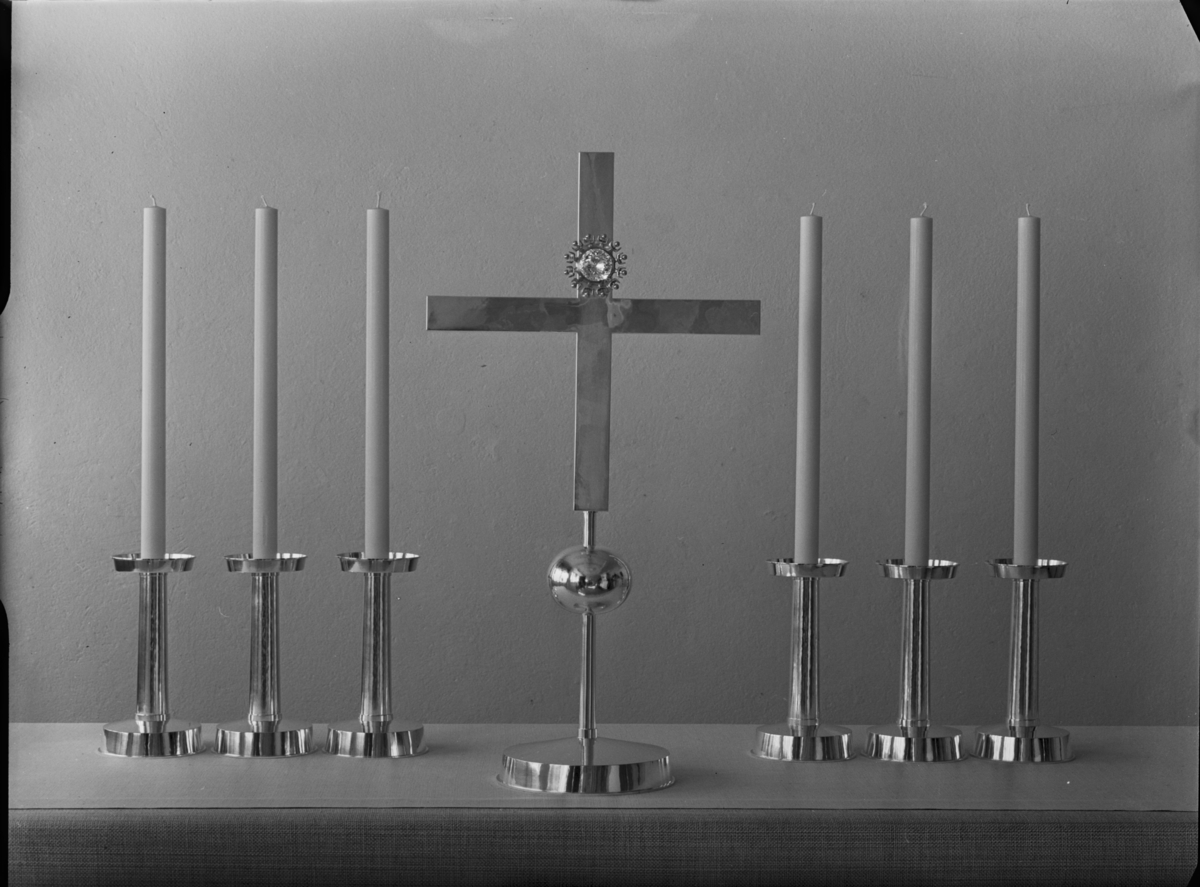 Altarkors med bergkristall och 6 st altarljusstakar i silver, Adolf Fredriks kyrka, Stockholm.