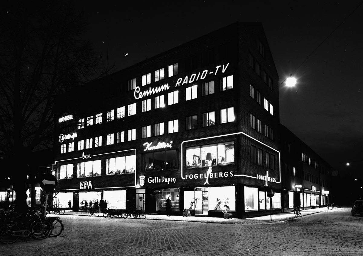 Exteriör. Fasad med upplysta fönster som vetter mot gata, kvällstid.