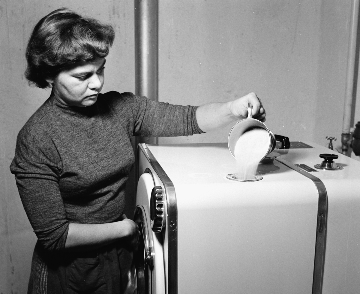 Interiör, tvättstuga i Stureby. Tvättmaskin och tvättande kvinna