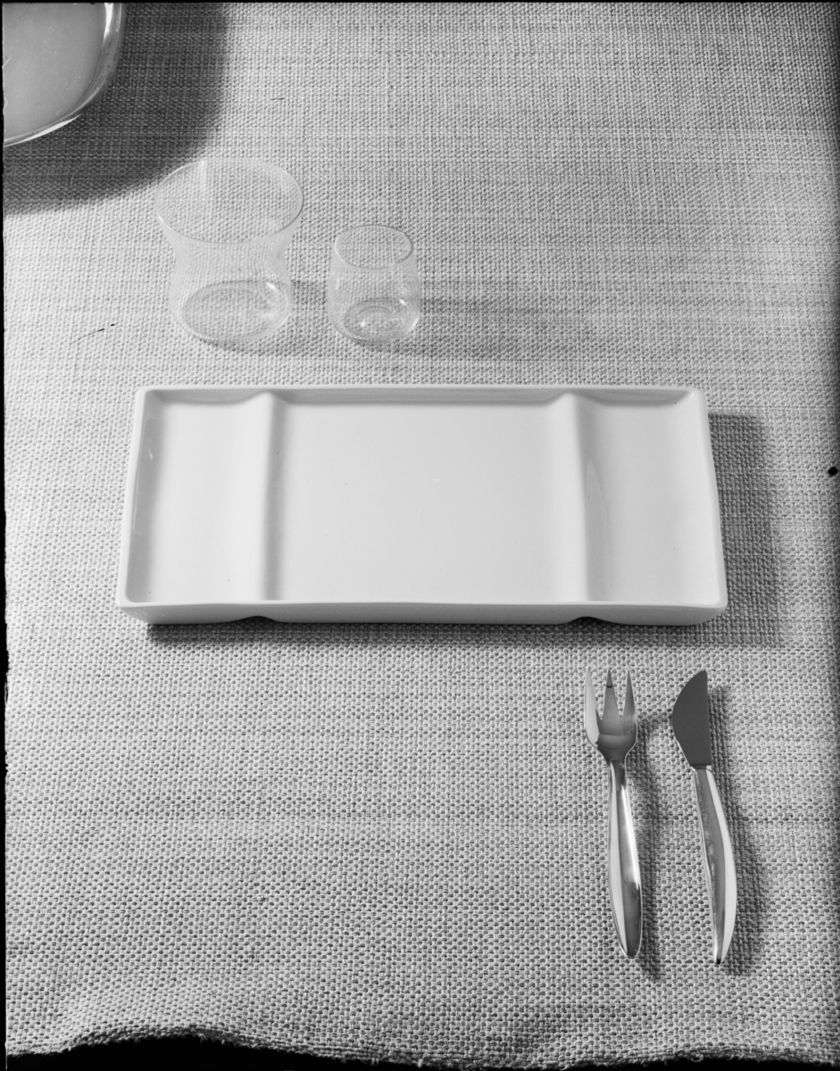 Utställt på separatutställning "Arkitektur og design Experiment og produktion" om paret Arne Korsmo och Grete Prytz (Korsmo) Kittelsen. Arrangerad av Svenska Slöjdföreningen i Skansenhallen, Skansen, Stockholm. Del av Scandinavian Design Cavalcade.
