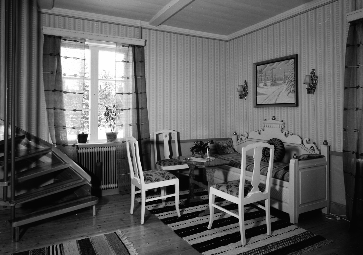 Interiör, soffgrupp vid den nybyggda trappan till övre våningsplan