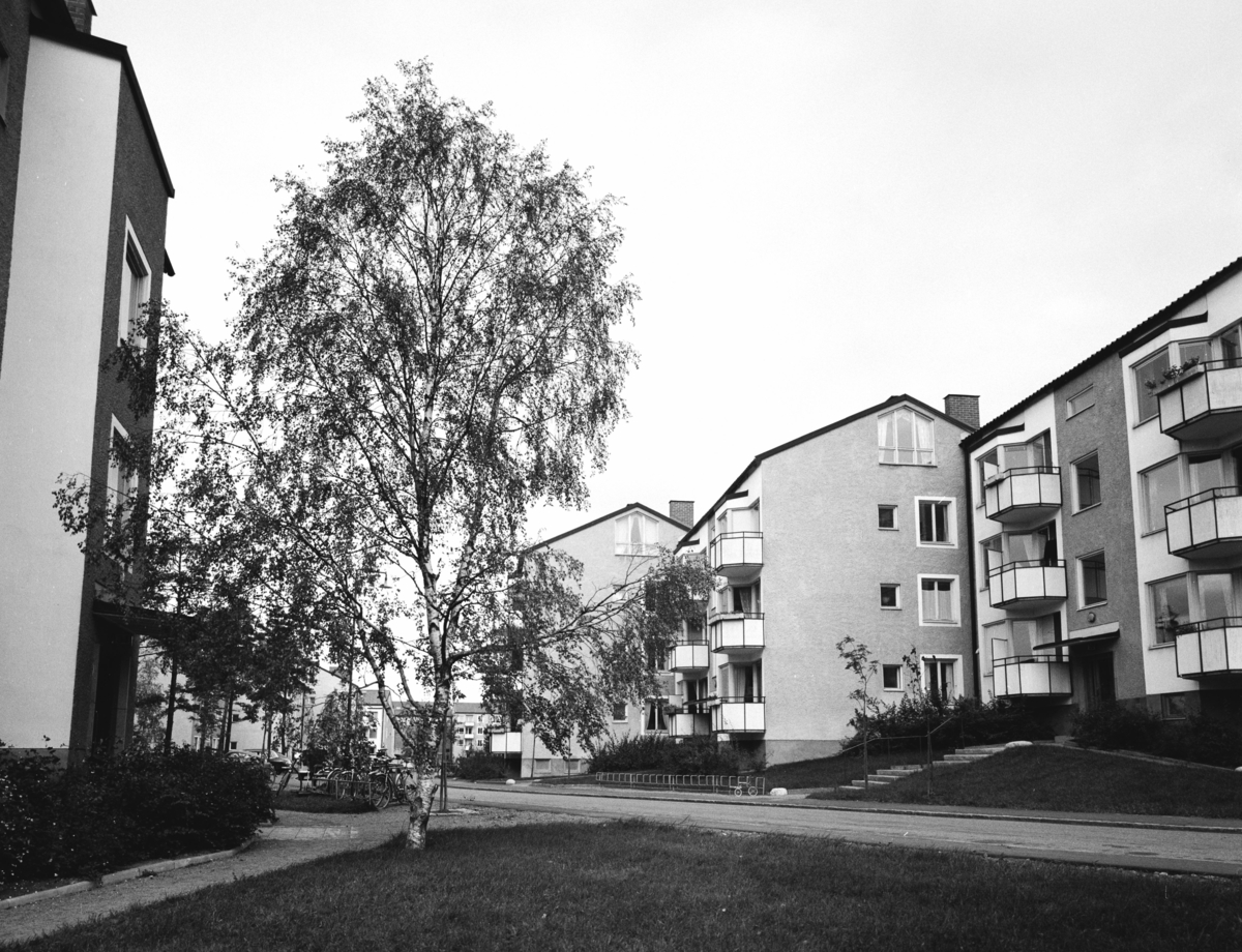Exteriör, bostadsområde, entré- och gavelfasader med högt lövträd.