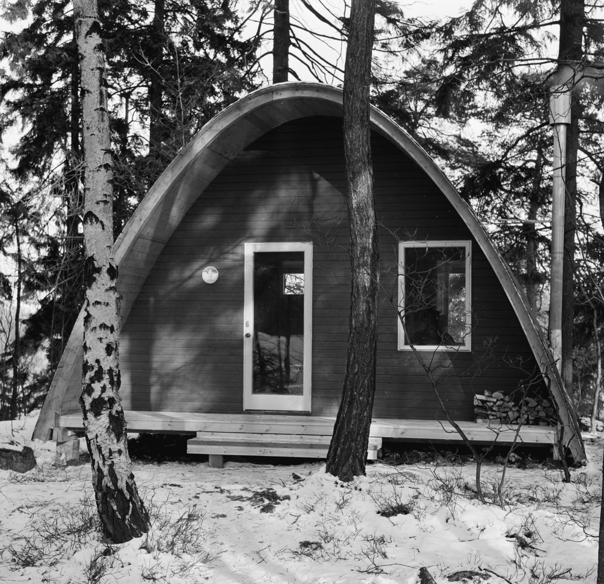 Exteriör, byggnad med rund takform i vinterlandskap bland höga barrträd