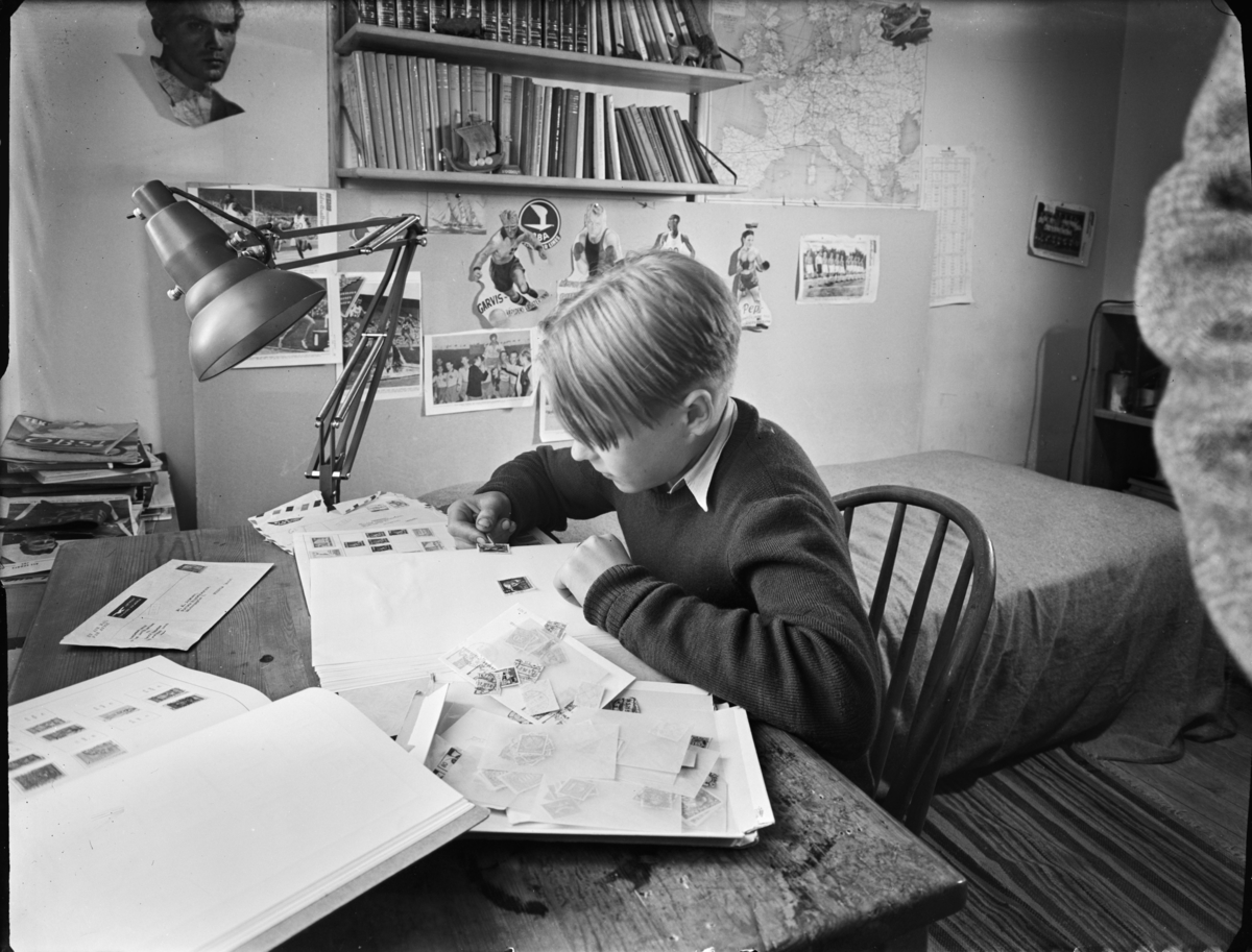 Pojkrum med en pojke som ordnar med sin frimärkssamling