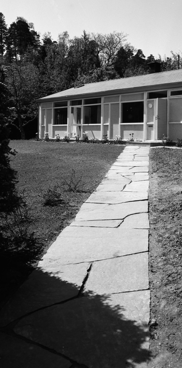 Exteriör, entréfasad med stenlagd gång i förgrunden som leder fram till entrén