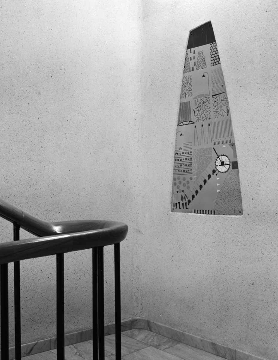 Detalj av trapphus med emaljmålning av Randi Fischer
