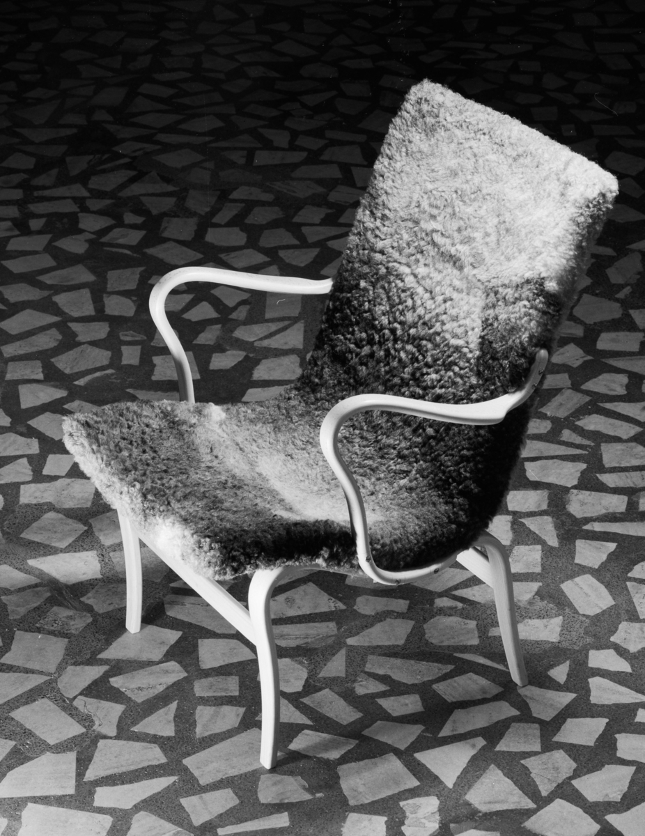 Interiör, fåtölj på mönstrat stengolv.