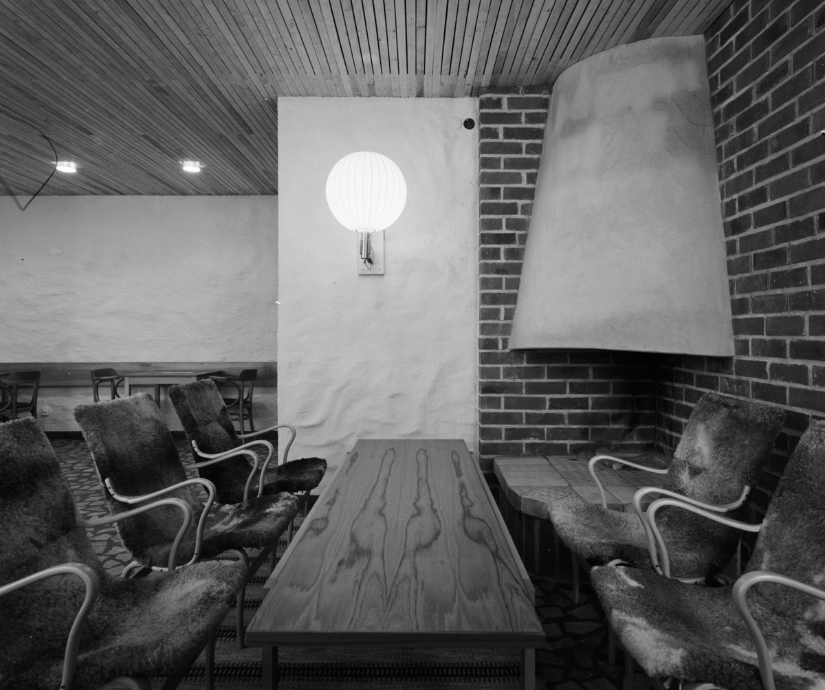 Interiör av sällskapsrum med fåtöljer och öppen spis