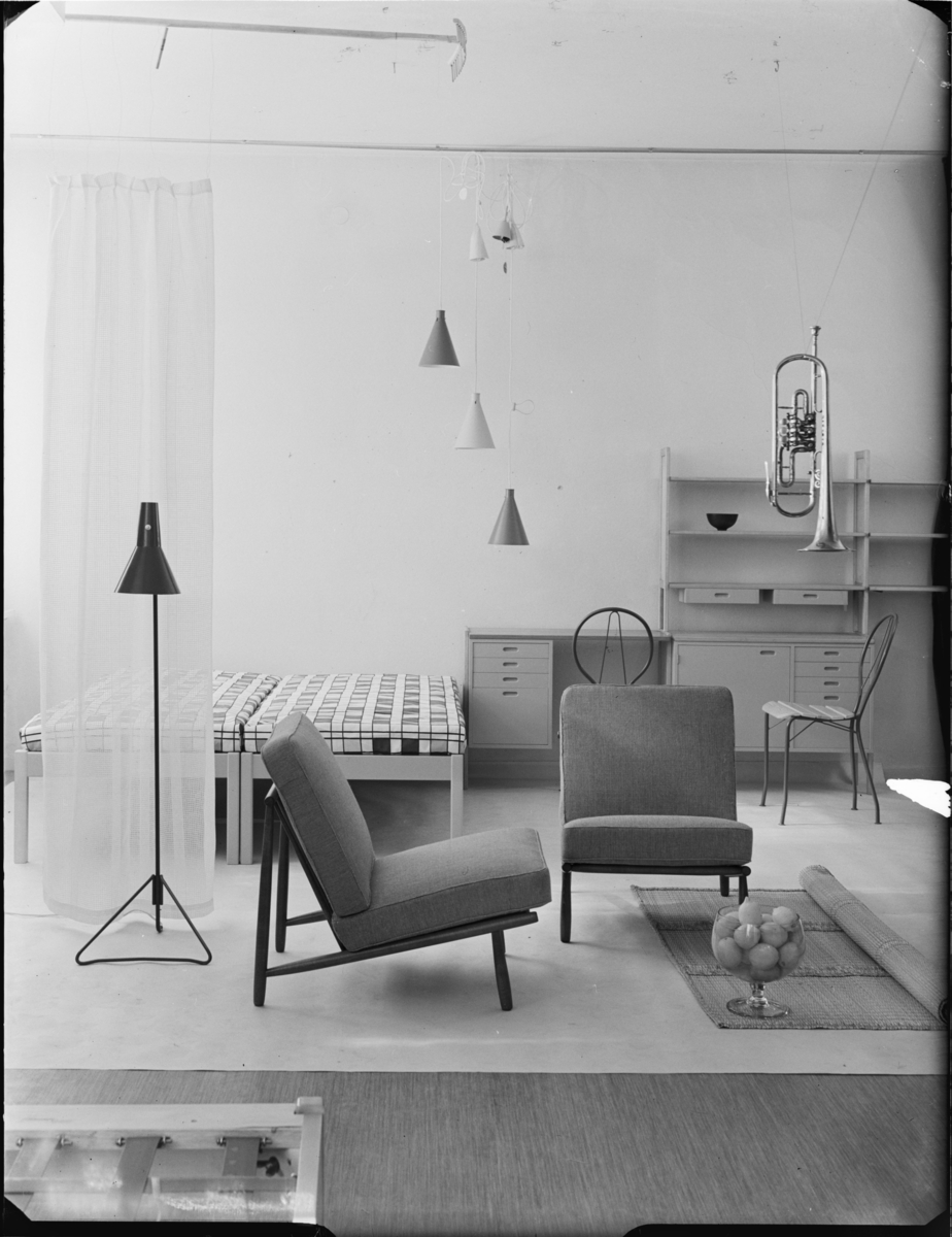 MÖBELUTSTÄLLNING I ATELJÉ, STOL HÄNGANDE, TRUMPET