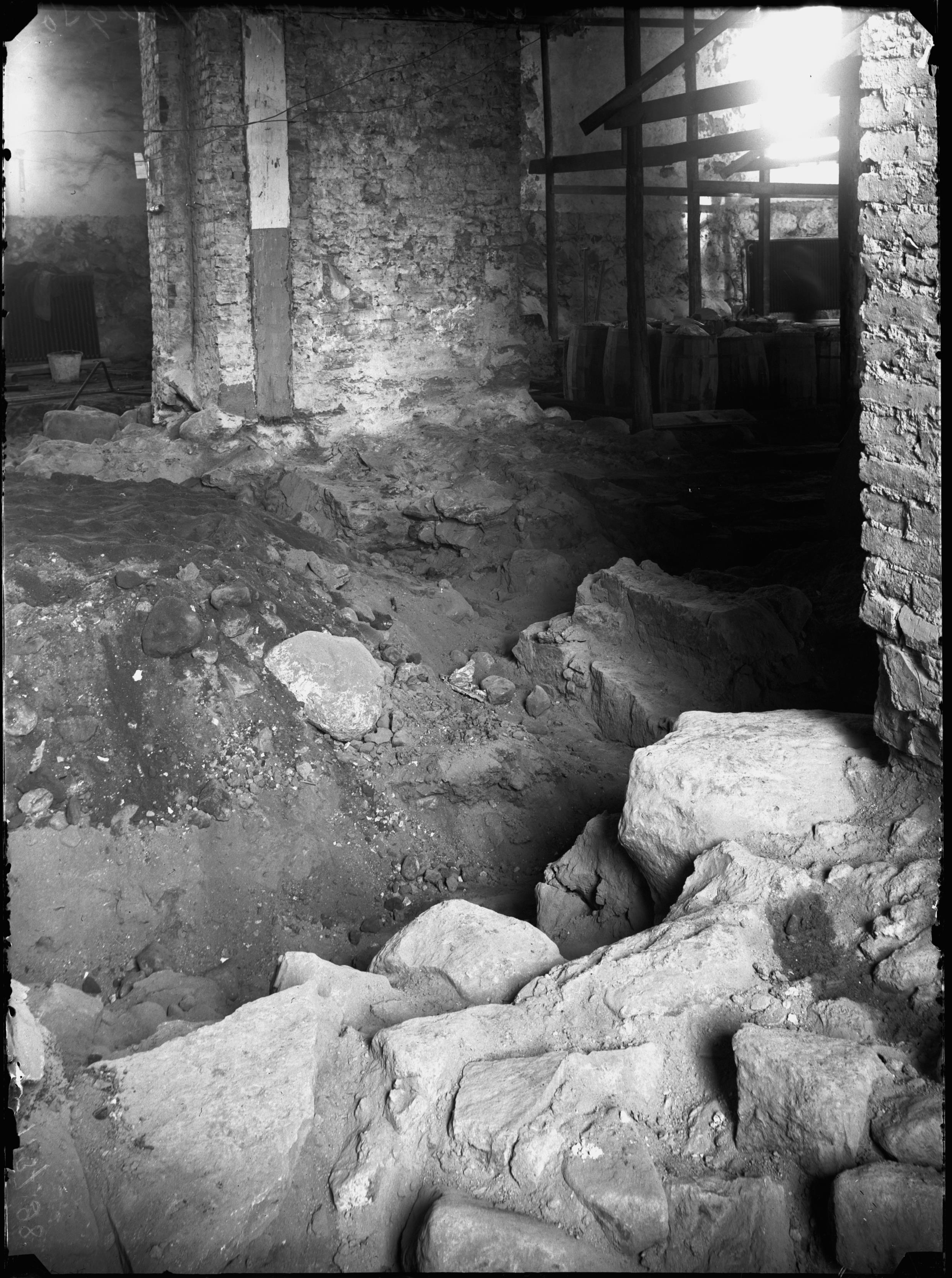 Rester av den ursprungliga västra gaveln mellan de båda västliga pelarna.