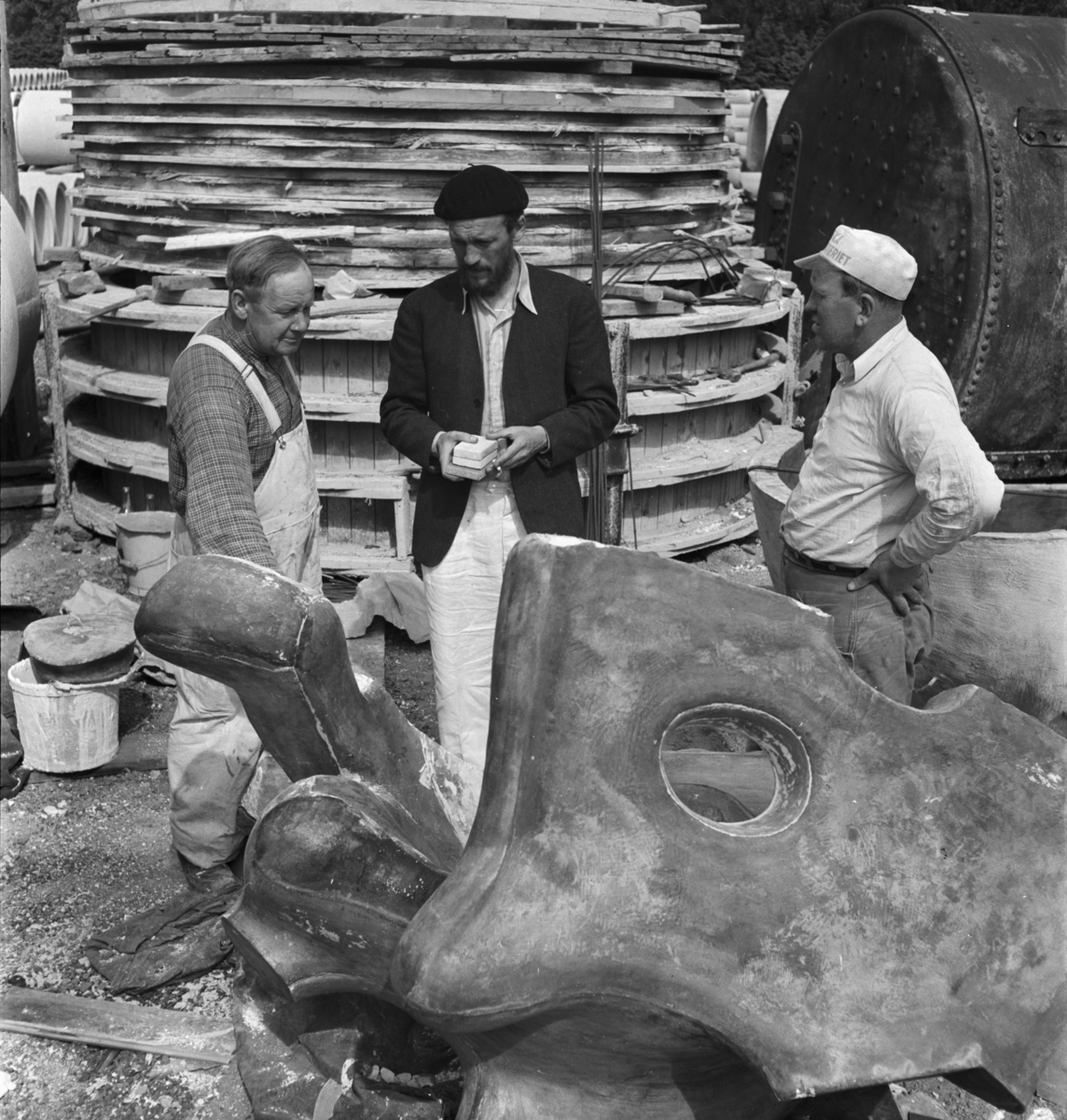Titel: Konstnären Egon Møller-Nielsen och medarbetare under arbetet med lekskulpturen Tuffsen