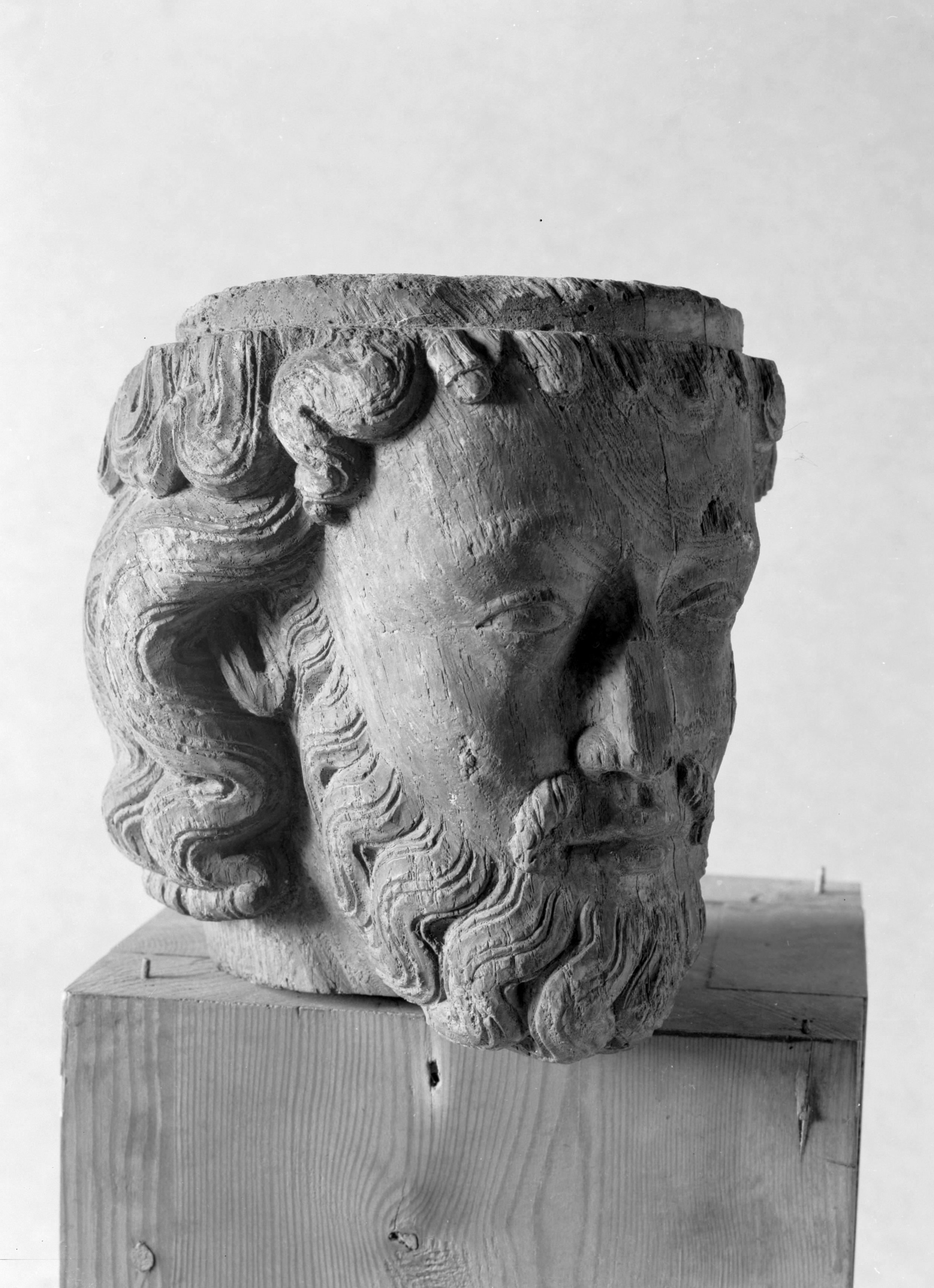 Skulptur av trä framställande huvud av manligt helgon. Omkring 1300.