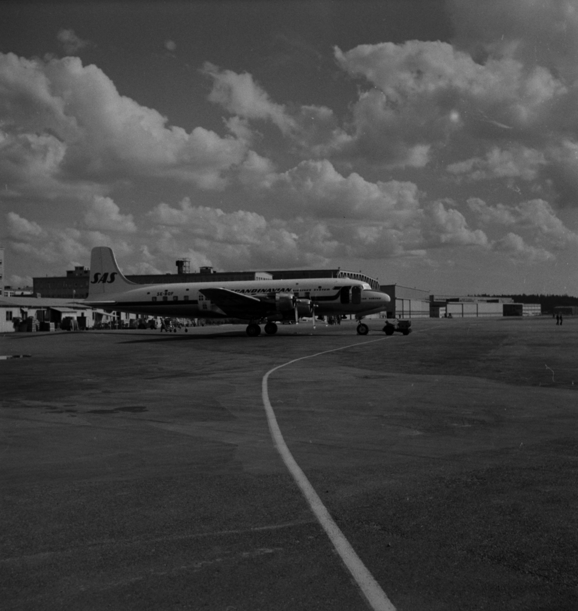 Grafisk Konst (herr Romell) Bromma: flygvärdinna, SAS-plan, bil o flyg parkeringsplats