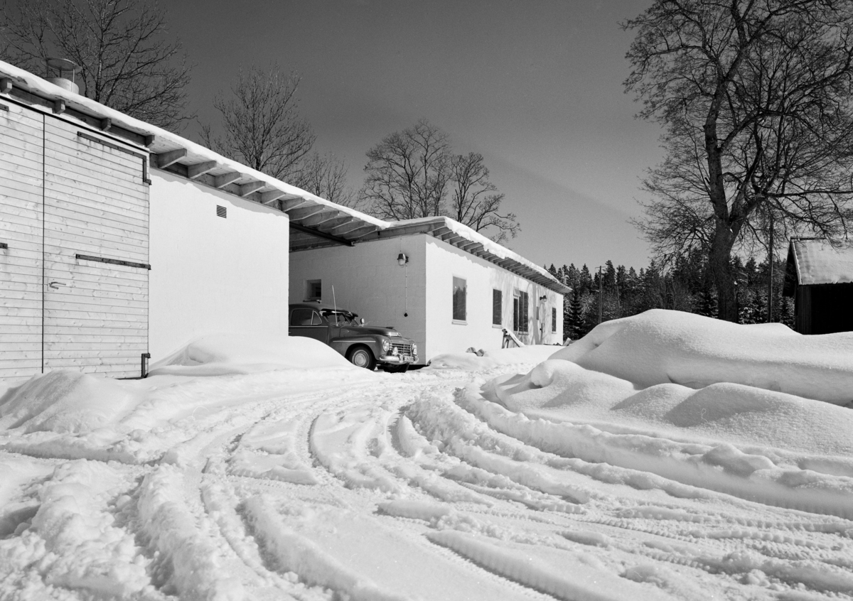 Exteriör, i solbelyst vinterlandskap. Bil parkerad vid byggnad.
