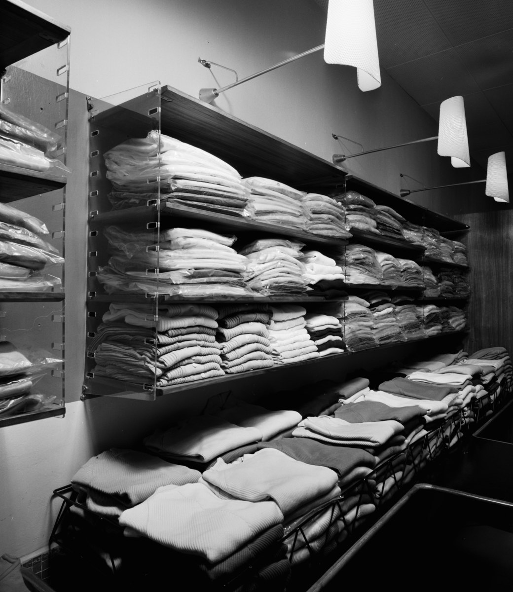 Interiör, butiksinredning med skjortor och tröjor i hyllsystem String Plex.