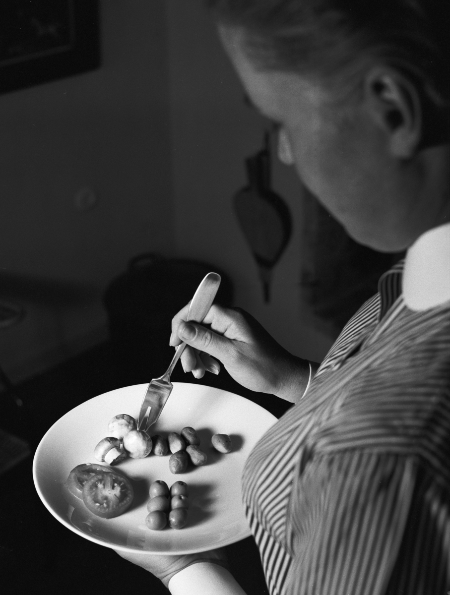 Stående kvinna med mattallrik och gaffel. C.-H. Stålhanes servis från Rörstrand och Servus bestick av Sigurd Persson från Kooperativa Förbundet