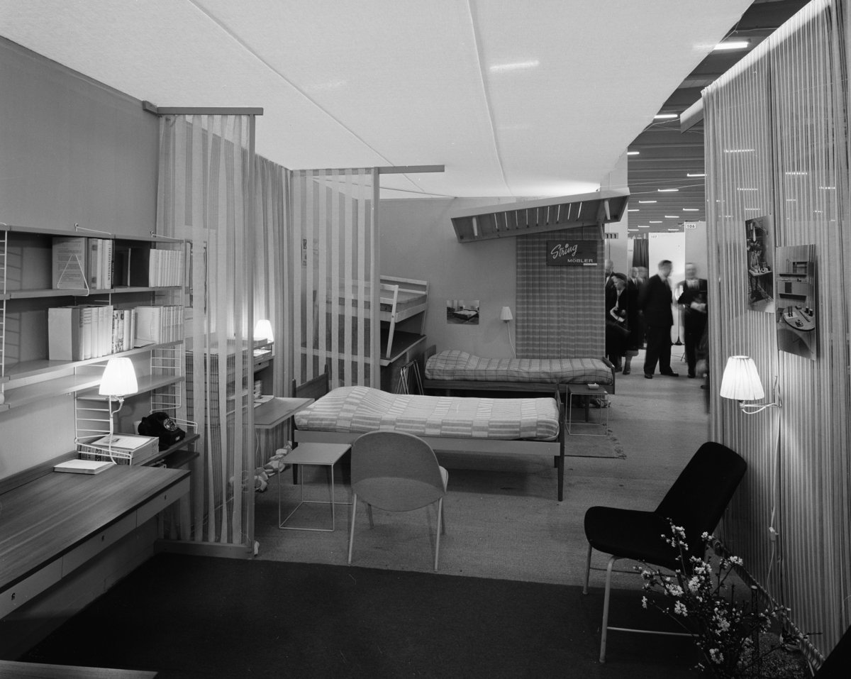 Titel: Interiör på möbelmässan i Sankt Erikshallen. Stringhyllor.
