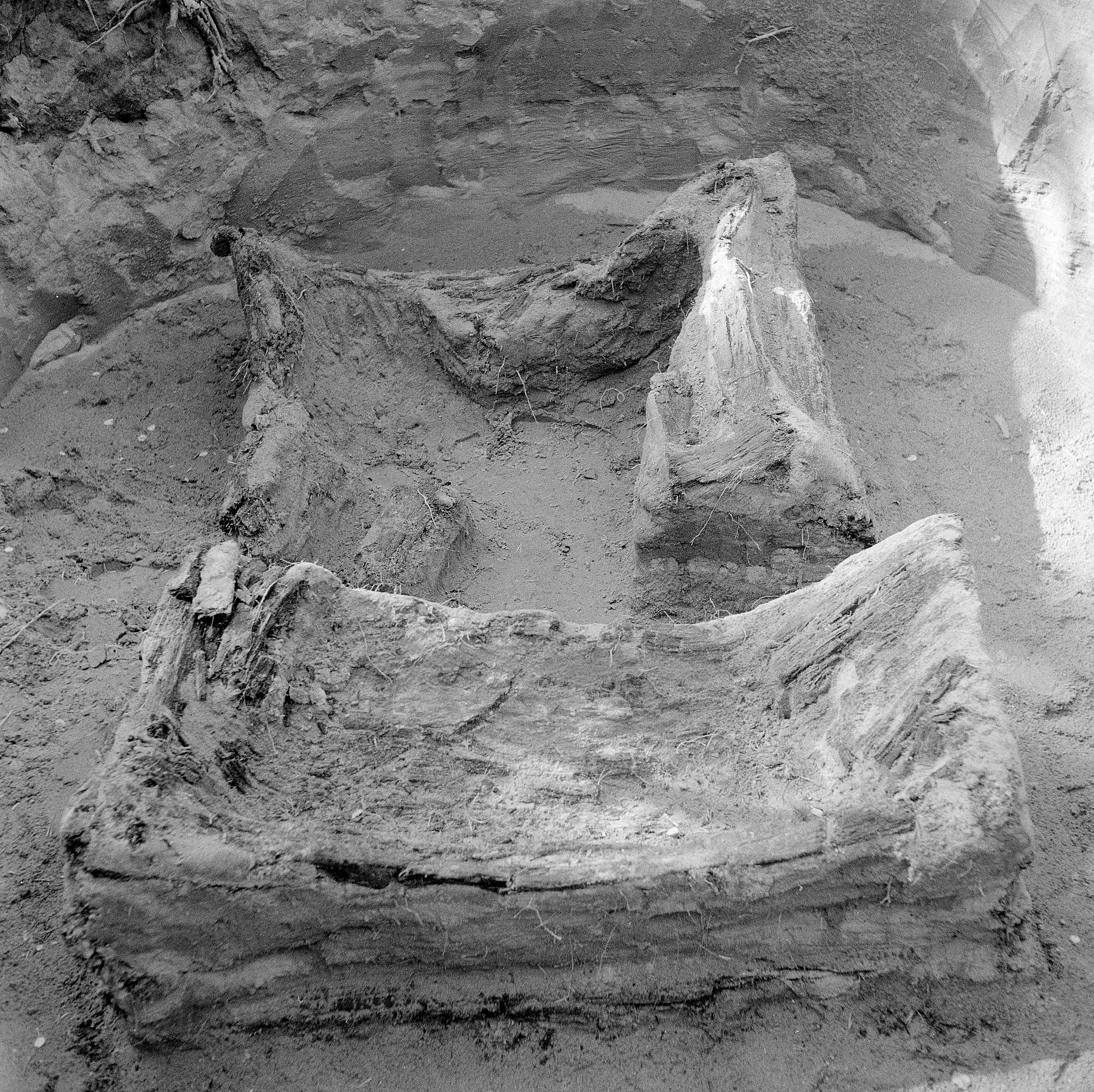 Åseleälven. Ramverket i fångstgrop 2 har utgjort en förstärkning eller skoning, som har förhindrat ras i den lösa sanden. Foto mot SV.