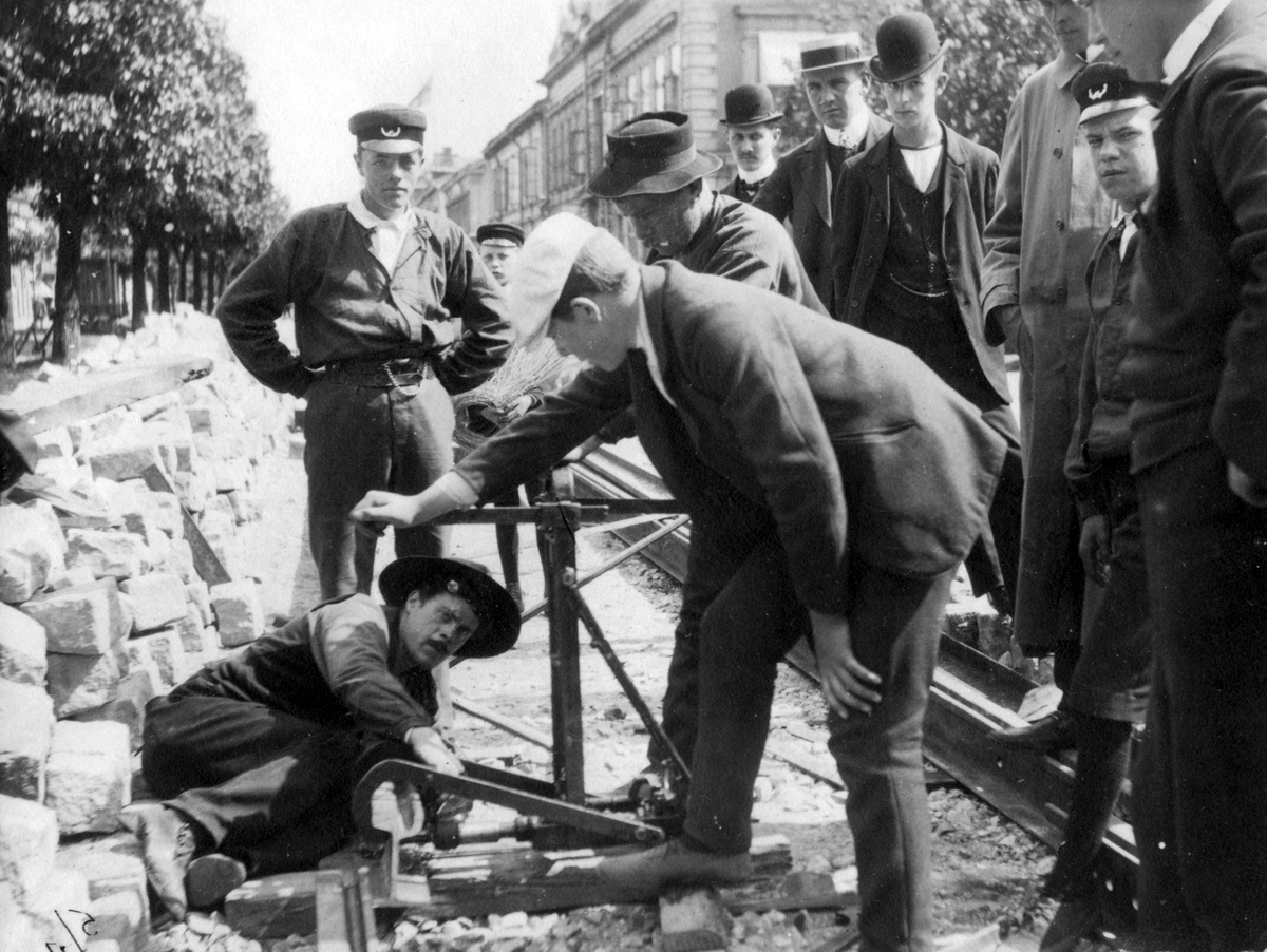 Spårarbete vid Rådhusesplanaden med intresserade åskådare.