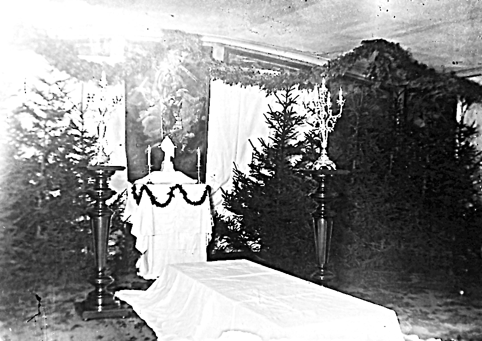 Växbo: "Wallins", gammelgården, begravning, troligen från Olof Wallins död. Han var född den 9 oktober 1843 och dog den 20 oktober 1904. På sin födelsedag fick han som kyrkvärd dessa två kandelabrar, som här fick lysa upp vid hans sista färd.