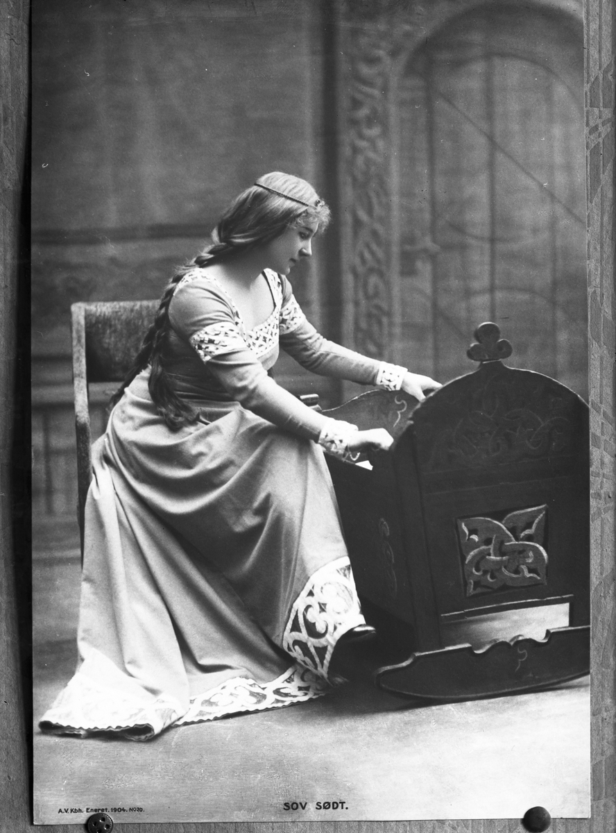 Repro av äldre konstbild. Kvinna vid vagga, "Sov sött".